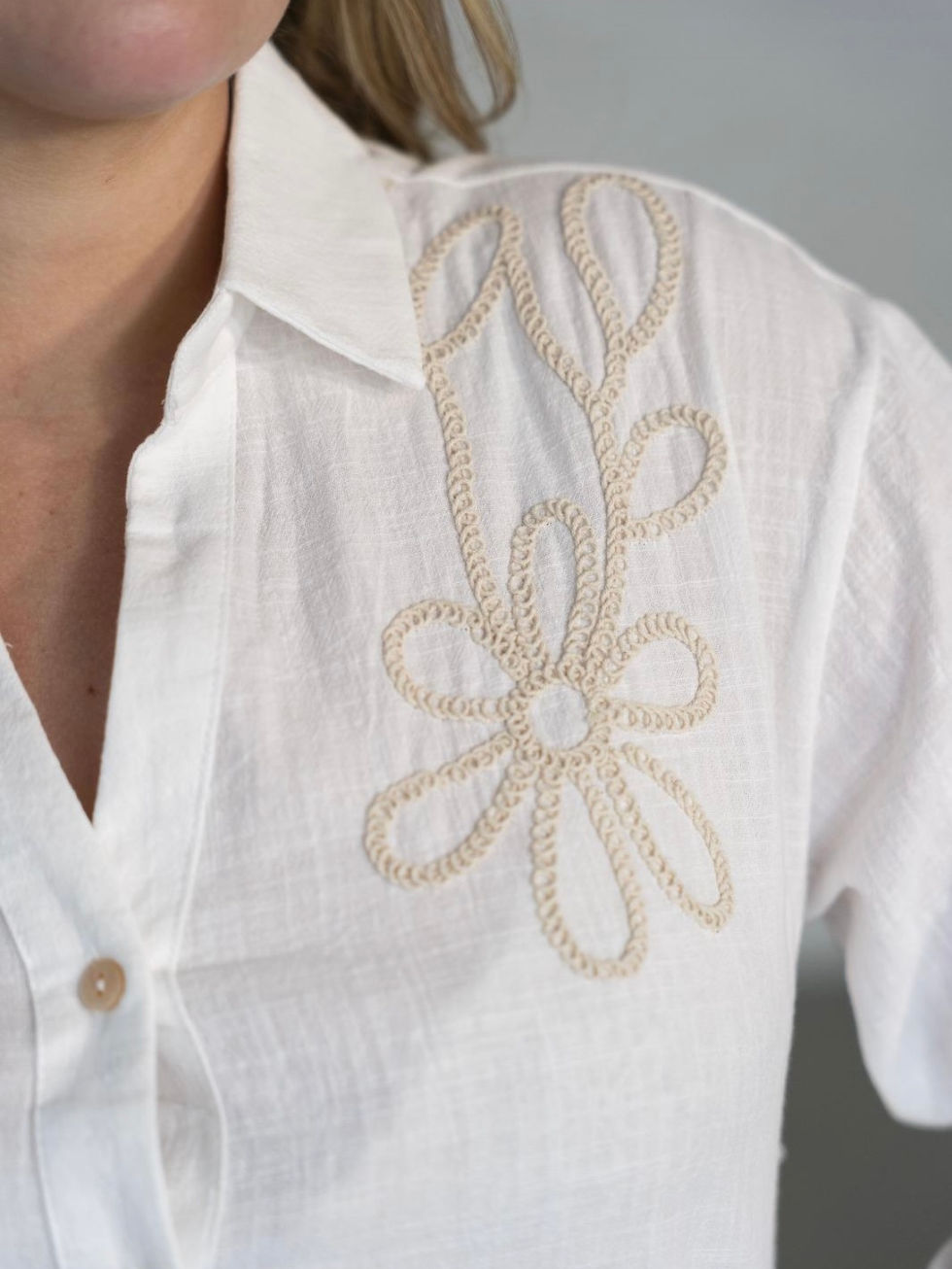 Camisa bordada, de corte relajado y estilo liviano. Talle único que va desde un S hasta un L. Disponible en blanca y beige. Talle: U.