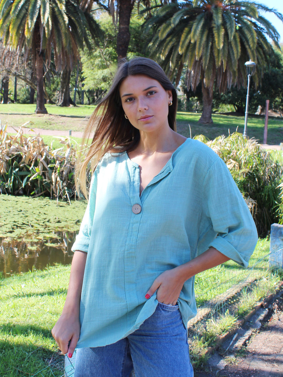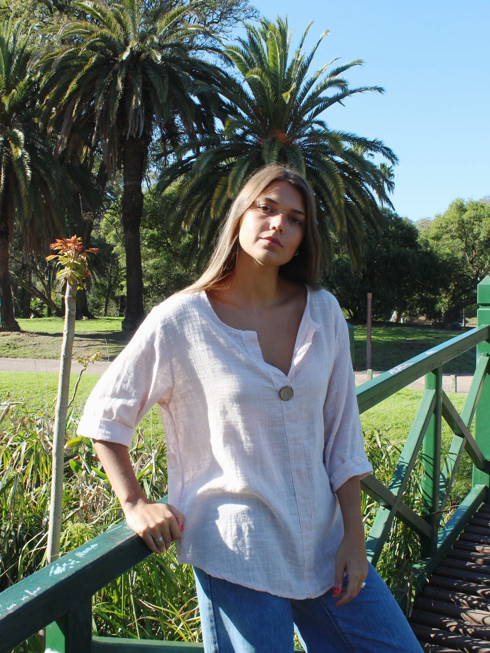 Blusa de lino con algodón, cuello mao y escote en V con botón de coco al frente.