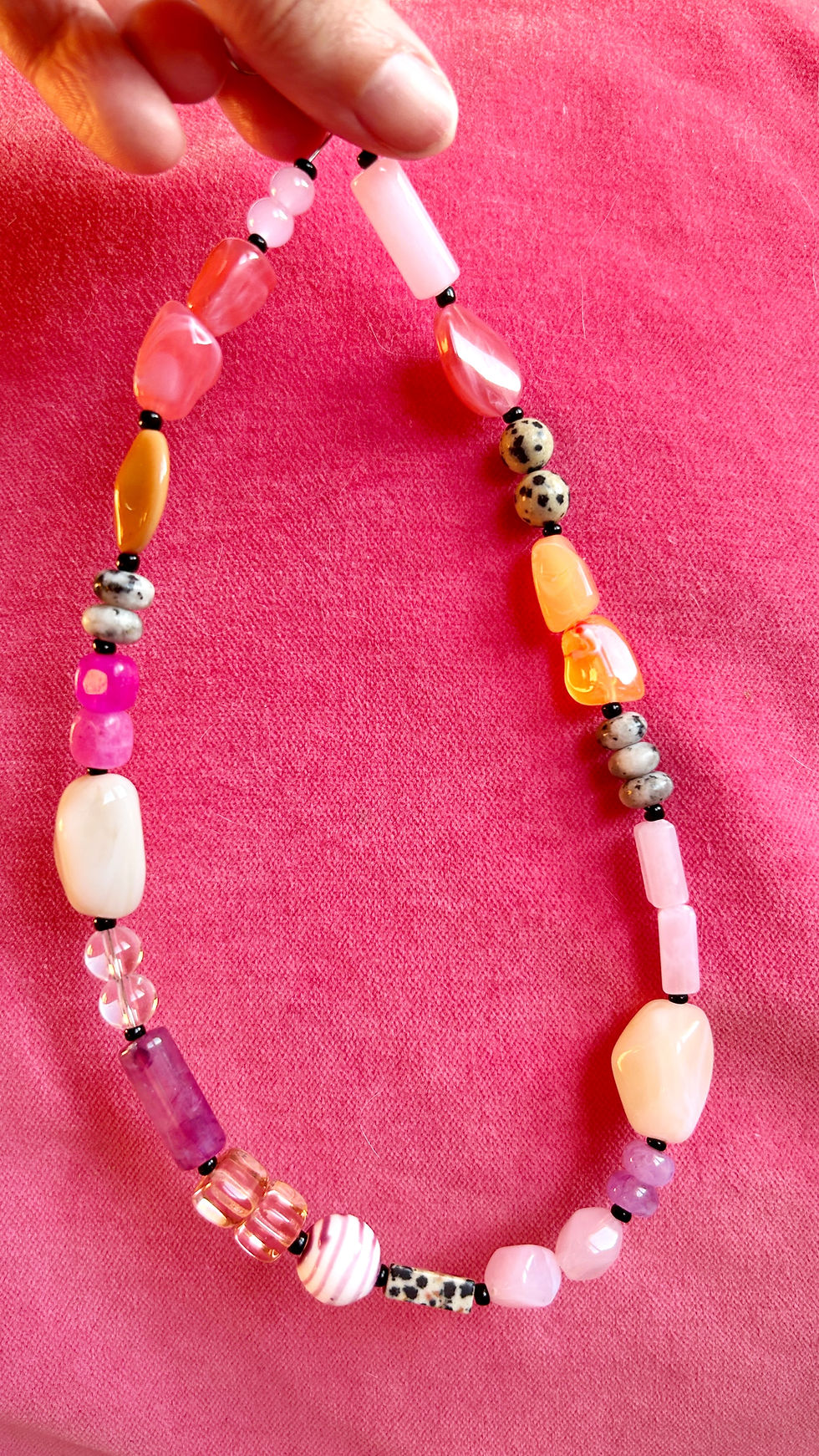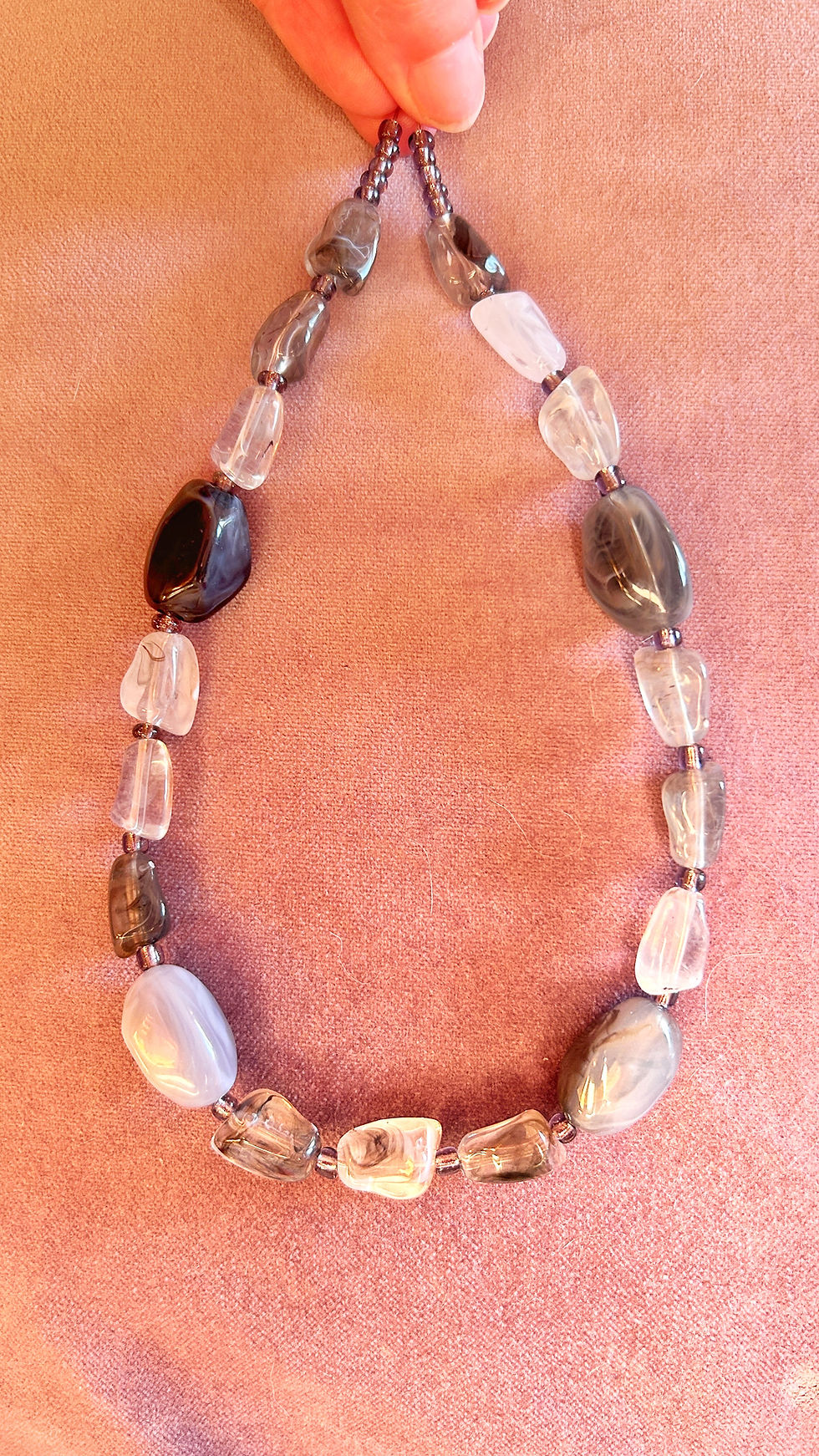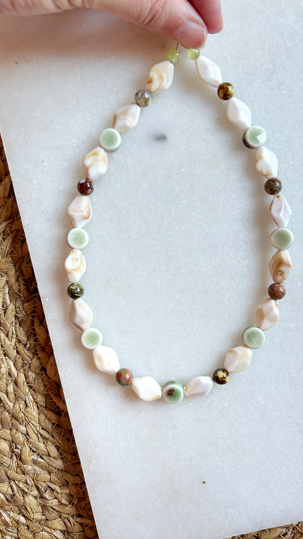 Collar realizado con cristales checos y piedras naturales en tonos de verde y celeste