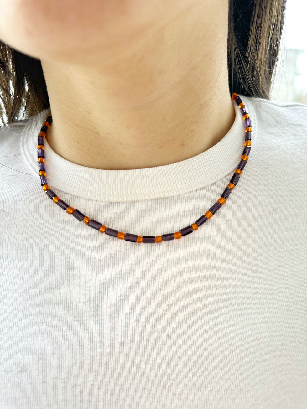 Collar realizado con mostacillas en tonos naranja y violeta, basico ideal para uso diario