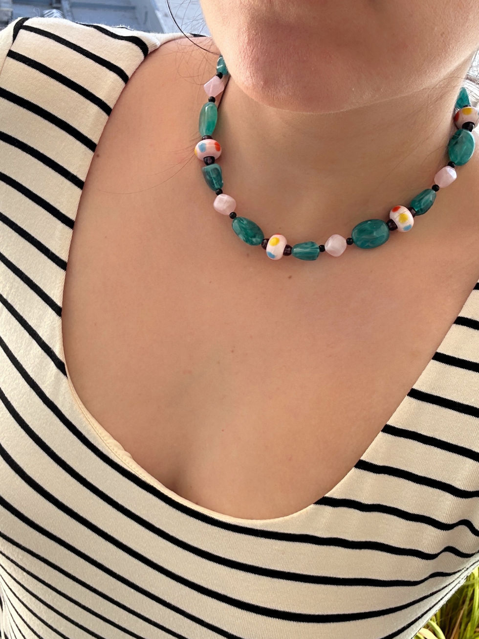 Collar realizado con un mix de cristales checos y cerámicas en tono petróleo y rosado.