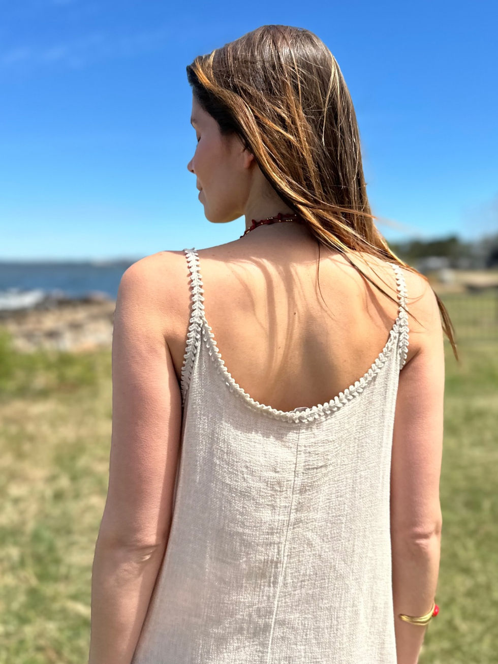 Vestido de lino rústico, de diseño simple y fresco. Talle único adaptable hasta un L. Disponible en beige. Talle: U.