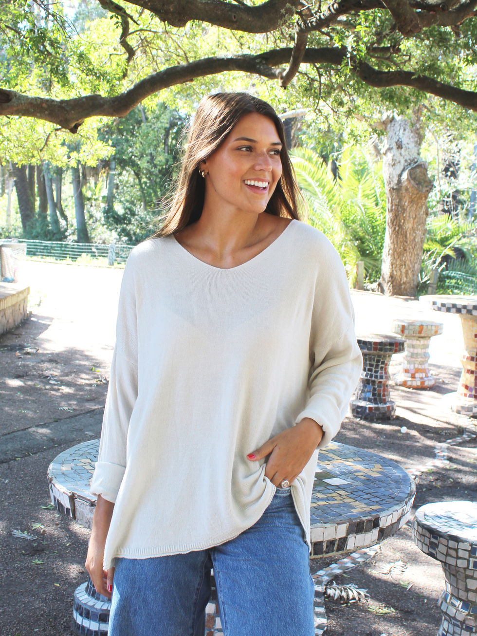 Buzo de hilo holgado, ideal para entretiempo. Se adapta hasta un talle XL. Disponible en beige y visón. Talle: U.